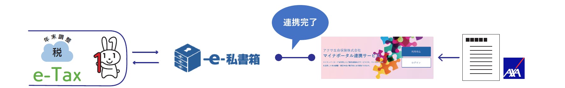 ​e-Tax の確定申告書等作成コーナーのマイナポータル等連携プラットフォームに、アクサ生命の控除証明書情報を自動で取得のうえ反映できます。