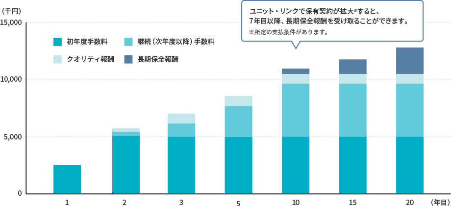 長期にわたる保障と資産形成を目的とした変額保険を対象とし、ご契約から7年以上ご継続いただいた契約に対し、7~20年目に支払う報酬です。